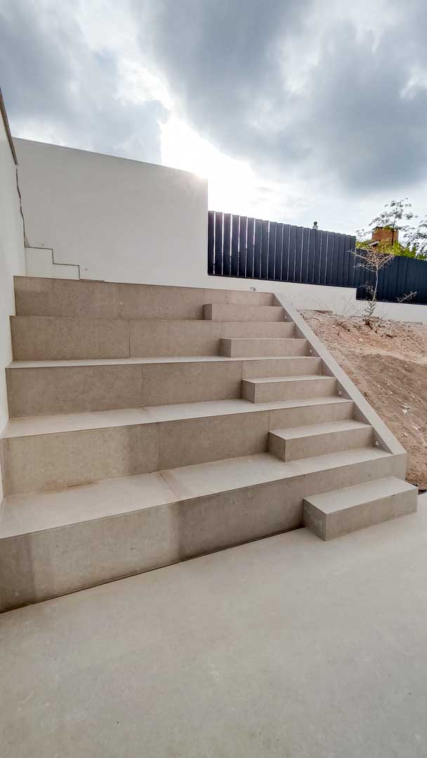 La iluminación exterior se plantea de forma contenida y precisa, reforzando la geometría de los volúmenes sin comprometer la privacidad interior. Líneas de luz integradas en zócalos, escaleras y recorridos peatonales guían el acceso y subrayan los planos horizontales, mientras que puntos de luz puntuales acompañan entradas y cambios de nivel.