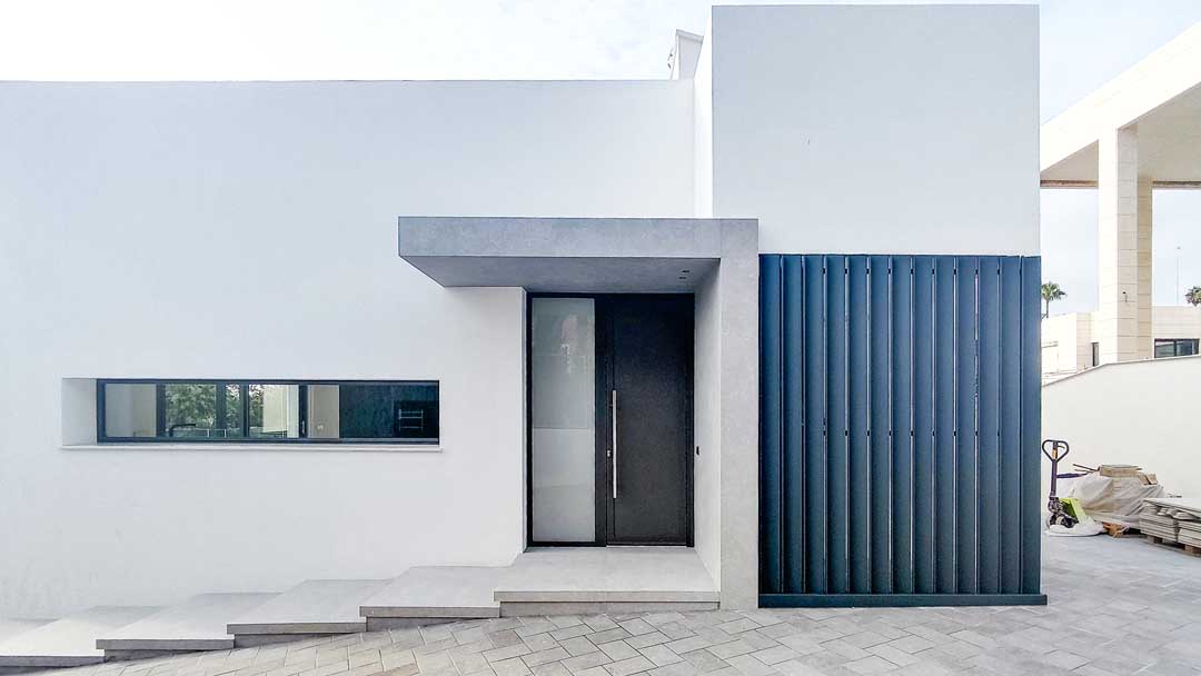 El acceso se plantea como una secuencia de planos y retranqueos que acompaña el recorrido desde la calle hasta el interior, reforzando la transición entre lo público y lo doméstico. La combinación de superficies blancas continuas con elementos más opacos permite graduar la relación visual con el entorno, aportando profundidad y control sin romper la claridad formal del conjunto.
