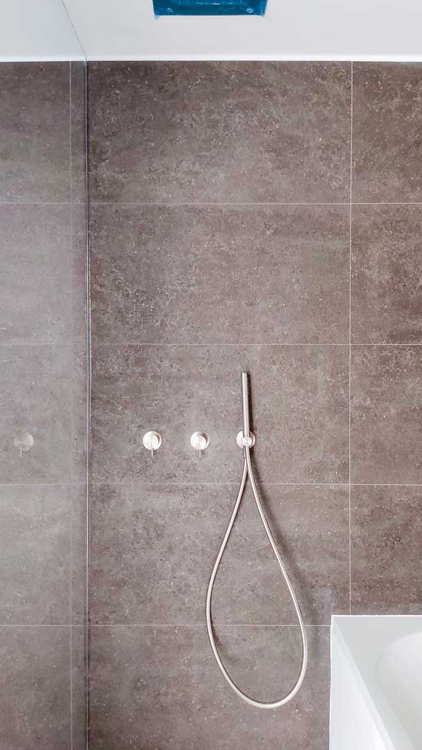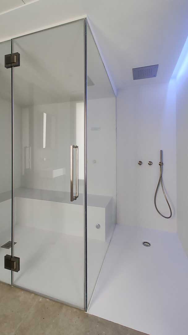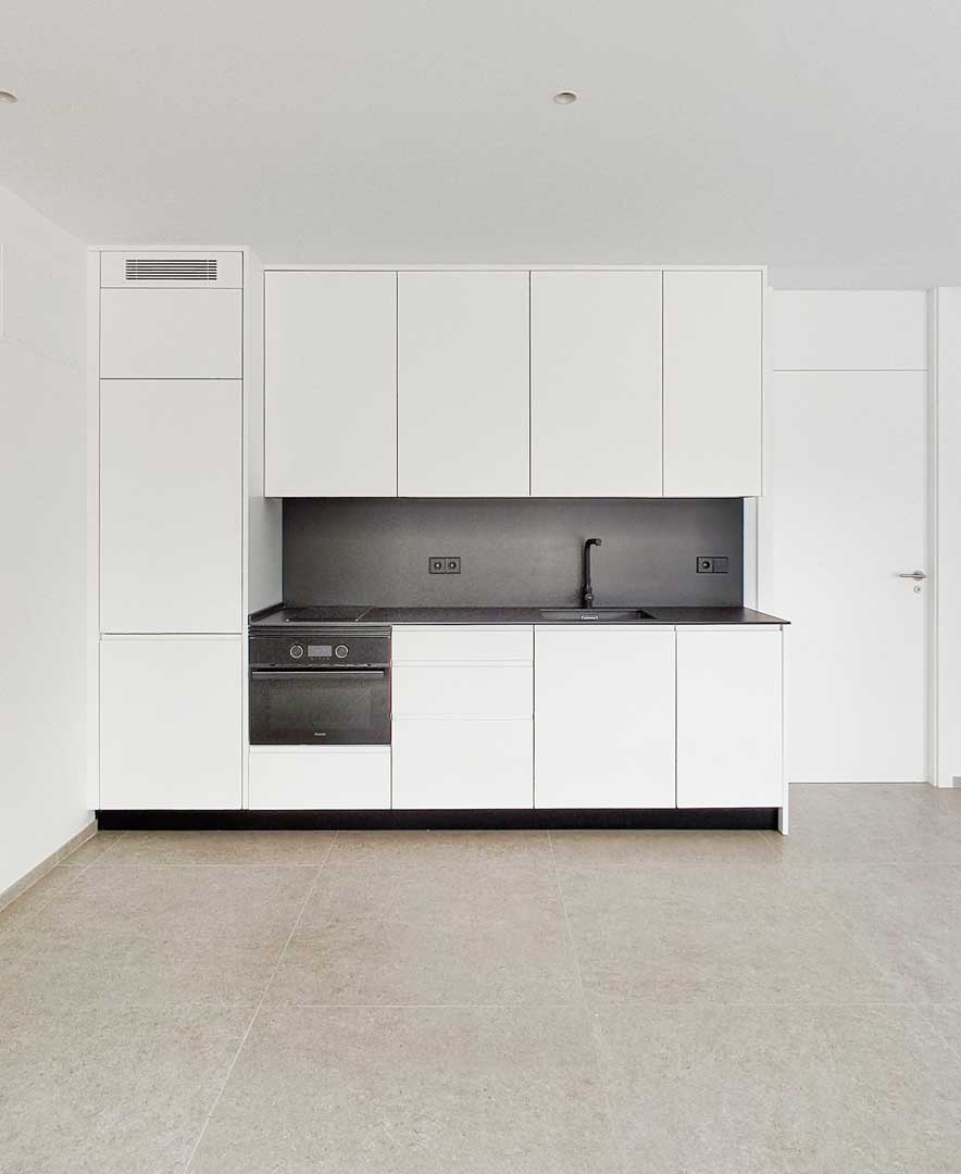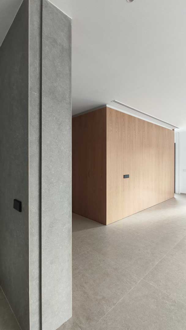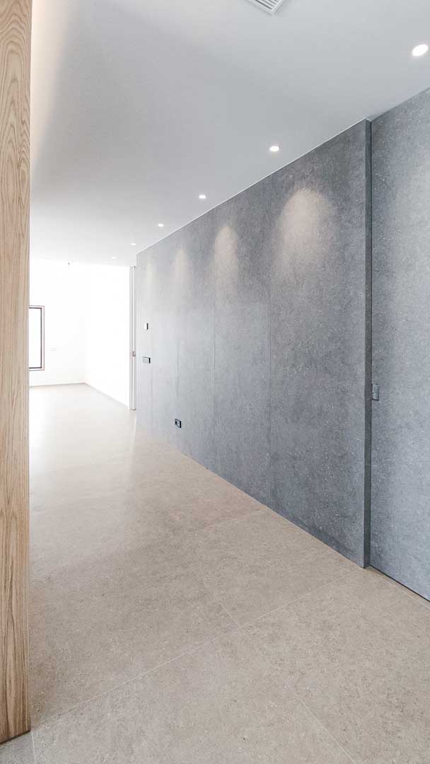 La materialidad juega un papel fundamental en la percepción del espacio. Los pavimentos continuos, los paramentos de acabado pétreo y los elementos de madera aportan calidez y equilibrio, mientras que la paleta cromática neutra refuerza la luminosidad y la sensación de amplitud. La carpintería interior se integra de forma discreta, enfatizando la limpieza formal y la ausencia de elementos superfluos.
