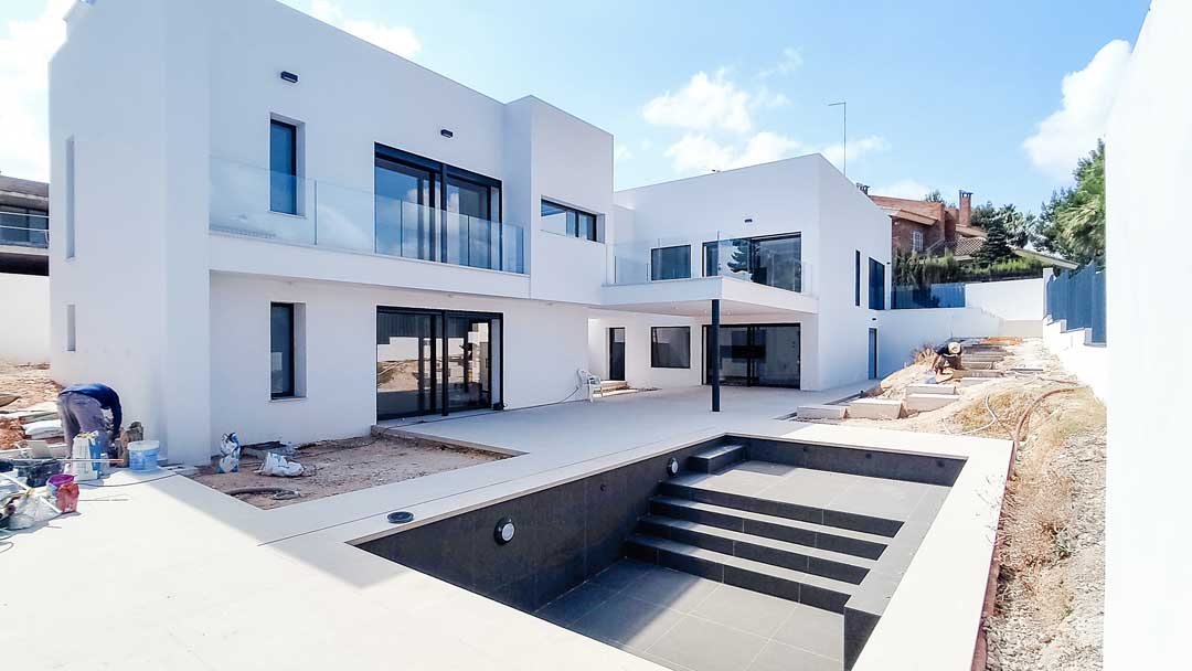 La arquitectura se formaliza mediante volúmenes puros y compactos, de geometría limpia y carácter sereno, que se adaptan a la topografía de la parcela. Las fachadas exteriores se muestran deliberadamente contenidas, con una lectura más maciza y controlada, limitando la apertura de grandes huecos hacia el exterior inmediato y protegiendo los espacios principales de las vistas de las parcelas colindantes.
