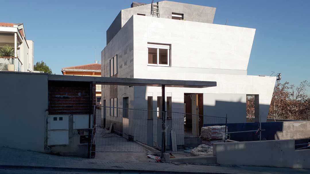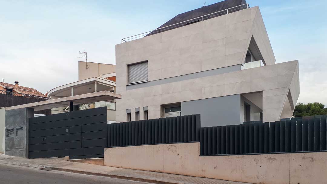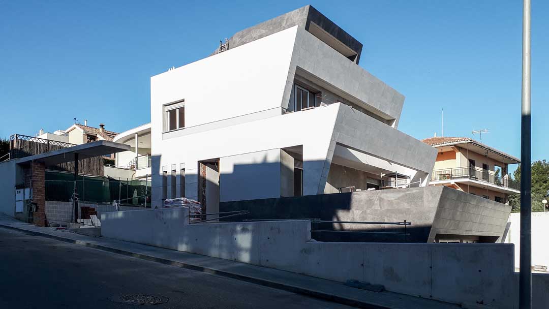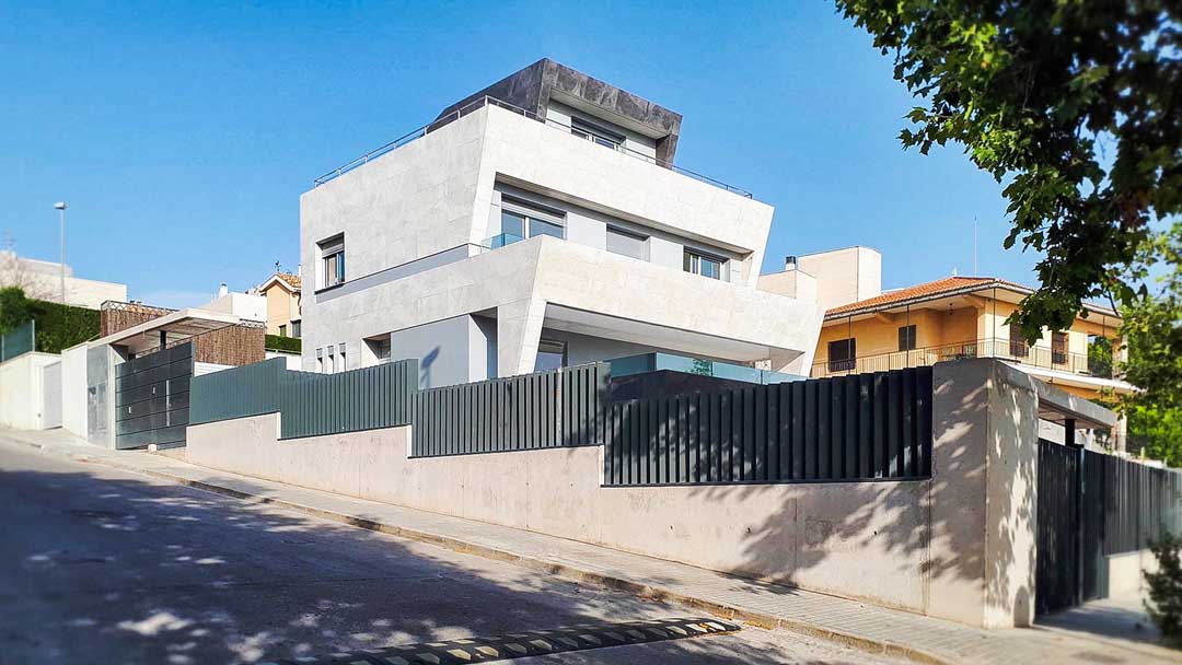La vivienda se concibe como una pieza arquitectónica clara y bien asentada, donde la volumetría escalonada y la geometría contenida responden tanto a las condiciones urbanísticas como a la necesidad de diferenciar los usos del conjunto. La edificación se adapta a la pendiente de la parcela, permitiendo separar de manera natural el ámbito residencial del uso terciario situado en el semisótano.