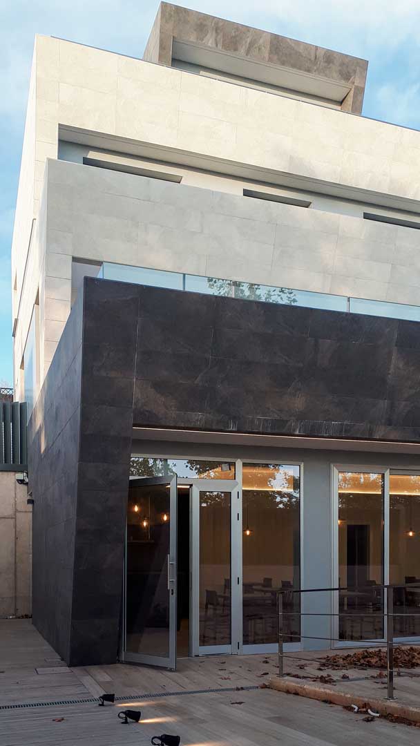 La relación con el exterior se construye a través de una terraza protegida, entendida como una prolongación natural del espacio interior. Los cerramientos y elementos verticales filtran las vistas desde el entorno urbano, creando un ámbito contenido y recogido, ajeno al tráfico y al ruido de la calle principal. La arquitectura actúa aquí como filtro y resguardo, generando un espacio exterior confortable y bien acotado para el uso del restaurante.