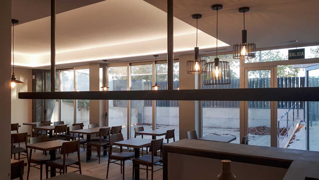 El restaurante se relaciona con el exterior a través de una terraza protegida, concebida como una extensión natural del espacio interior, donde la arquitectura filtra las vistas y genera un ambiente recogido y confortable. En el interior, la organización funcional, la materialidad sobria y una iluminación cuidadosamente integrada construyen un espacio cálido y flexible, adaptado al uso cotidiano del local.