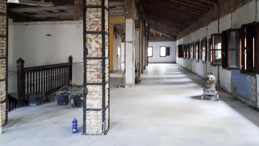 En el interior, la reforma pone en valor los espacios existentes mediante la actualización de revestimientos, enlucidos de yeso, pavimentos de baldosas hidráulicas y falsos techos, combinando criterios de conservación con soluciones actuales que mejoran la iluminación, la acústica y el confort de uso. La carpintería de madera, tanto interior como exterior, se sanea y rehabilita cuidadosamente, preservando su valor material y su presencia en la arquitectura original del edificio.