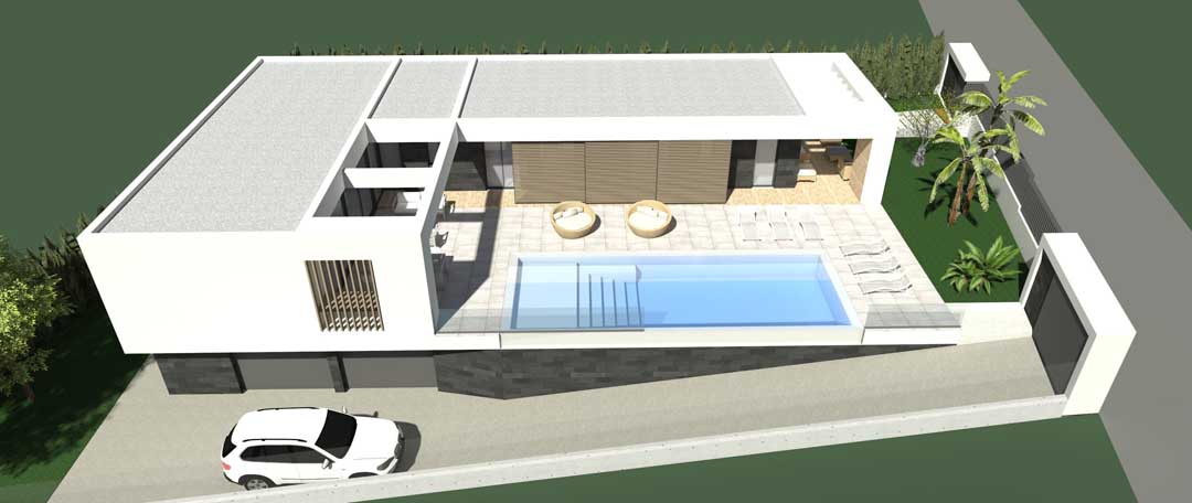 La forma en “L” abraza la terraza y la piscina, configurando un espacio exterior protegido, soleado y visualmente controlado, que actúa como una extensión natural de la vivienda. El acceso peatonal se produce a través de un recorrido longitudinal ajardinado desde la calle, mientras que el acceso rodado aprovecha el desnivel lateral para descender al garaje en sótano con una intervención contenida sobre el terreno.