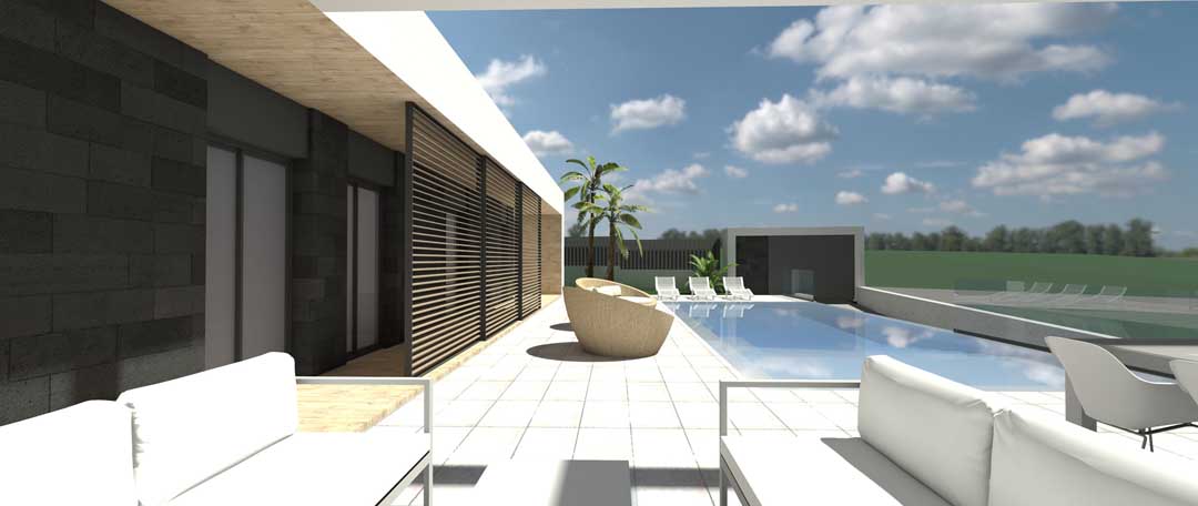 La vivienda se plantea como una arquitectura doméstica esencial y silenciosa, desarrollada en una única planta y cuidadosamente ajustada a la topografía del lugar. La geometría en “L” organiza el programa en torno a una terraza central con piscina, entendida como espacio de encuentro, regulación climática y referencia visual constante, convirtiéndose en el verdadero núcleo ambiental de la casa.