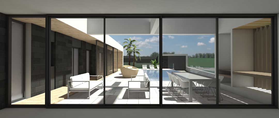 El control solar se convierte en una pieza clave del proyecto. Una estructura porticada abierta alberga una veranda que tamiza la luz sobre la zona de día, mientras que voladizos y sistemas de lamas correderas permiten regular la radiación solar y la privacidad en las estancias más expuestas. El conjunto se completa con una lectura unitaria de materiales y cerramientos, reforzando una imagen sobria, abstracta y contemporánea, profundamente ligada al lugar.